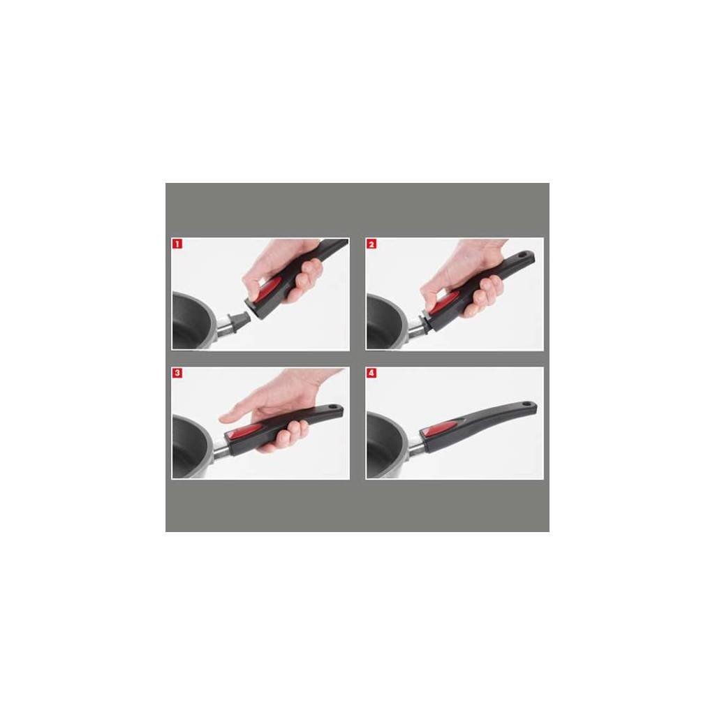 El mecanismo patentado del mango extraíble con aislamiento térmico garantiza un manejo cómodo. La parte de soporte de las asas o manijas se funde en la fundición de la sartén. Forman una sola unidad, lo que garantiza un ajuste seguro. Las sartenes con asas extraíbles son especialmente adecuadas para las familias con niños pequeños, ya que las asas no sobresalen de la placa de cocción ni de la encimera.