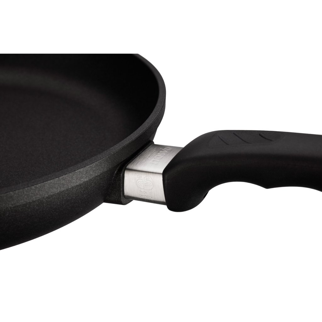 El mango sintético ergonómico con empuñadura antideslizante para el pulgar y orificio para colgarlo garantiza un agarre cómodo. La parte de soporte del asa está moldeada en la fundición de la sartén. Forman una sola unidad, lo que garantiza un ajuste seguro. Otra ventaja de la serie Titanium Nowo es la perfecta distribución y acumulación del calor. Las sartenes se pueden utilizar en todos los tipos de calor, excepto la inducción, incluso para la cocción en el horno, hasta 250 °C.