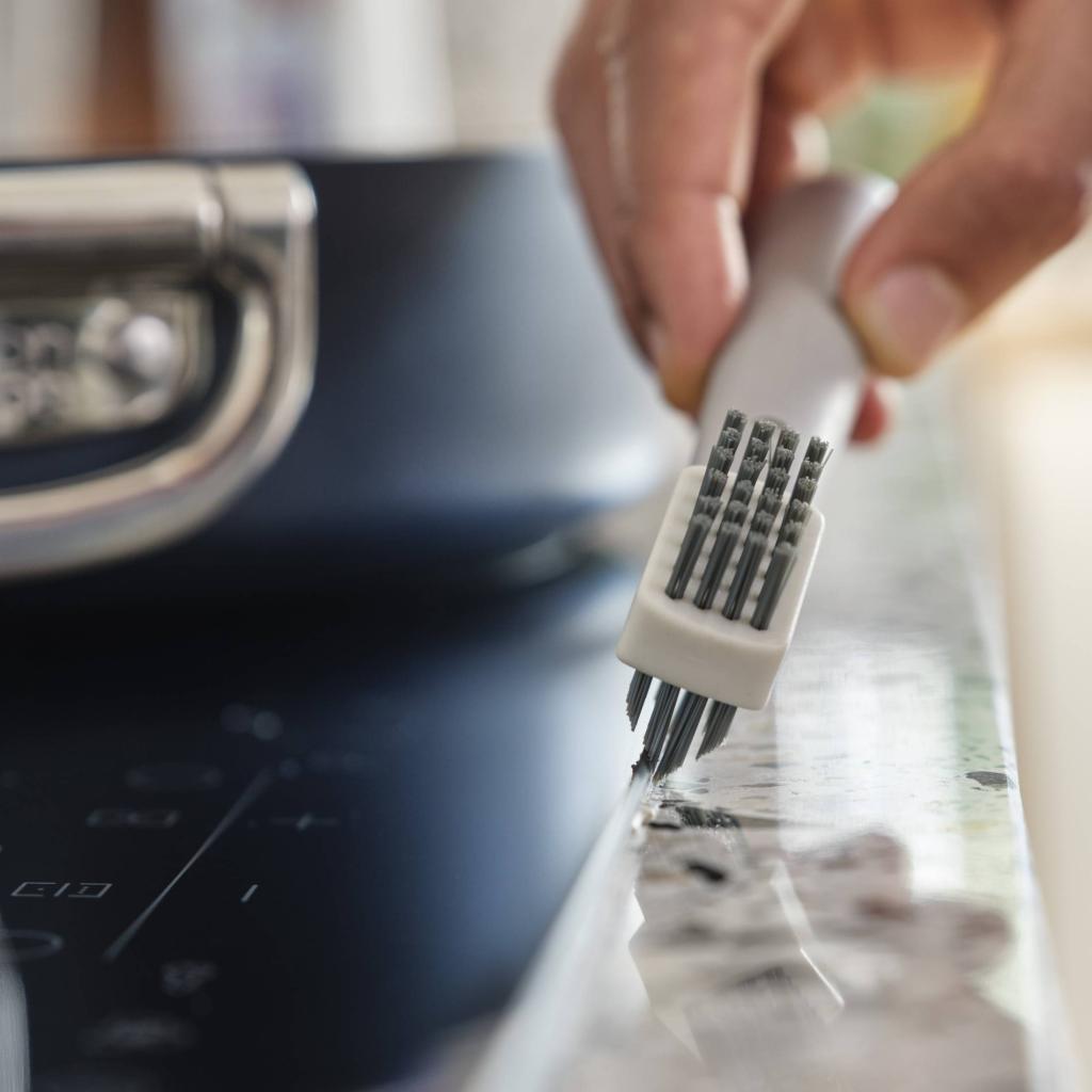 - El cepillo limpiador también incluye una rasqueta integrada para eliminar depósitos rebeldes o residuos secos.
