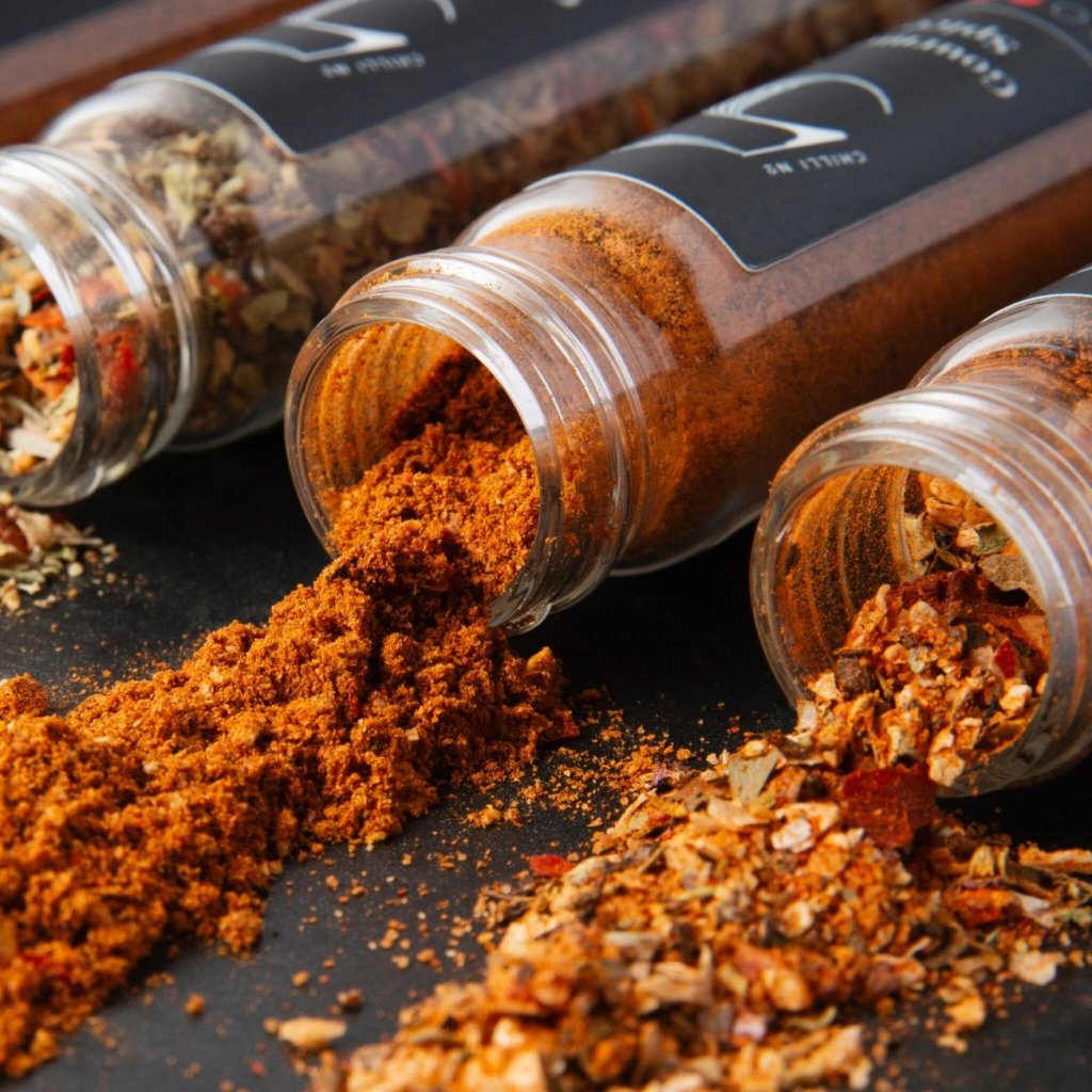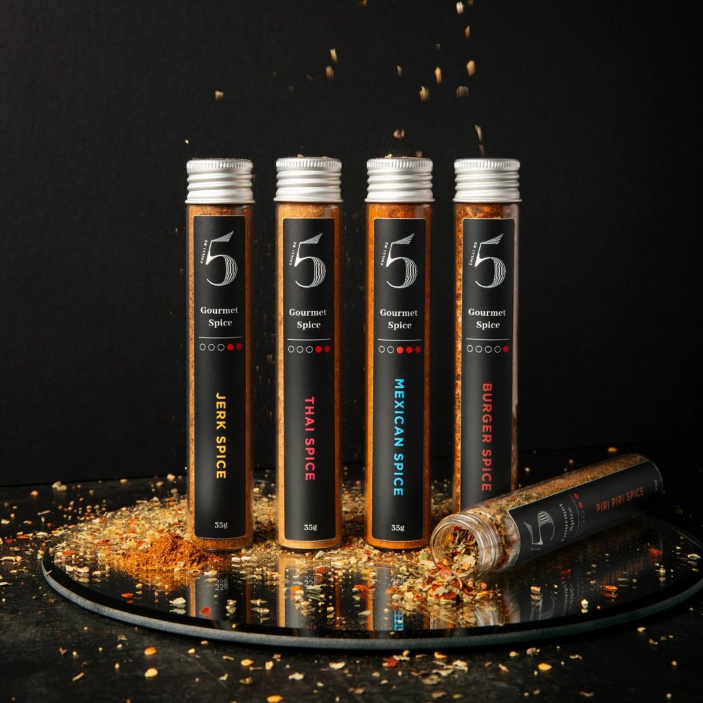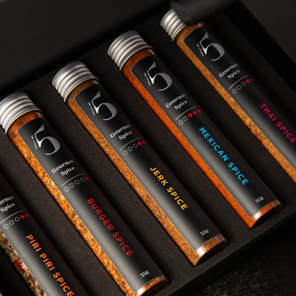 - Set de regalo SPICES, RUBS & SEASONING de Chilli No5 contiene cinco tipos de mezclas de especias con un peso de 35 g que le darán a sus platos un sabor y aroma intensos inspirados en cocinas de todo el mundo.