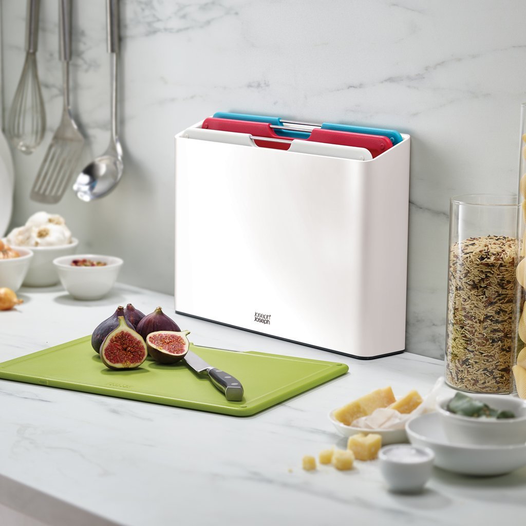 Los puntos fuertes de las tablas de cortar de plástico son sin duda su fácil mantenimiento, su higiene y, sobre todo, el hecho de que son sensibles a nuestros cuchillos. El objetivo de los diseñadores de Joseph Joseph esta vez era proporcionar las tablas a la mano en la encimera, para producir tablas únicas para cumplir el propósito 100%, y también para resolver su almacenamiento elegante. El soporte para tablas de cortar Folio es un juego para los trabajos más comunes en la cocina.