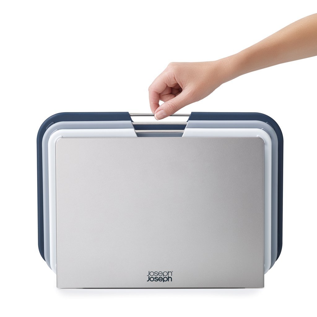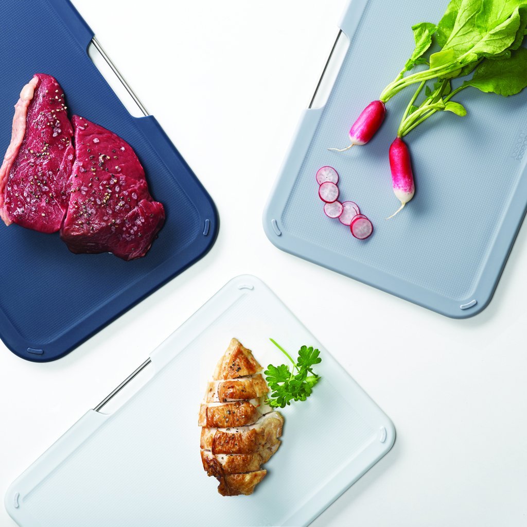 Los puntos fuertes de las tablas de cortar de plástico son sin duda su fácil mantenimiento, su higiene y, sobre todo, el hecho de que son sensibles a nuestros cuchillos. El objetivo de los diseñadores de Joseph Joseph esta vez era proporcionar las tablas a la mano en la encimera, para producir tablas únicas para cumplir el propósito 100%, y también para resolver su almacenamiento elegante. El soporte de la tabla de cortar Nest es un juego para los trabajos más comunes en la cocina.