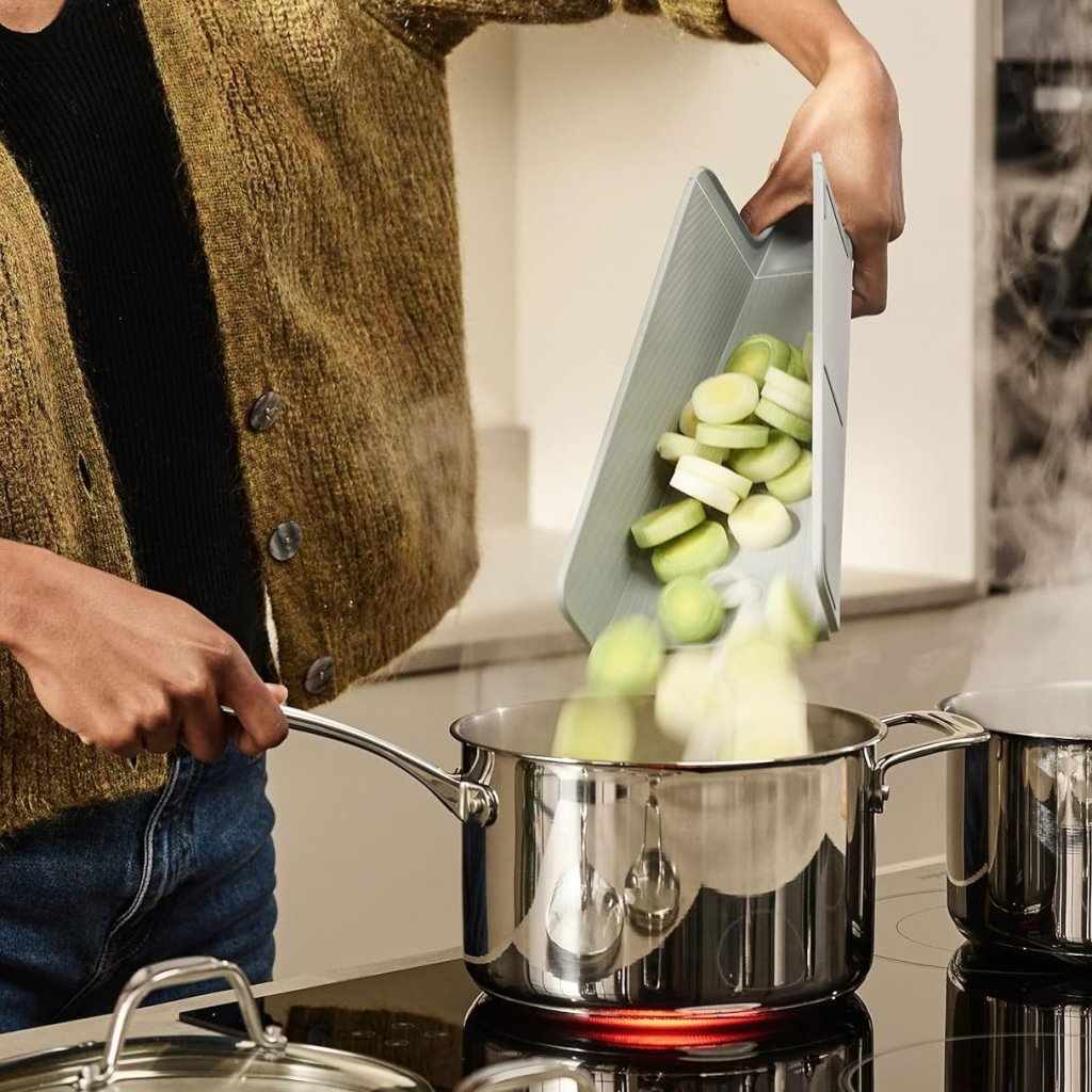 - solución innovadora para transferir alimentos cortados a ollas y sartenes