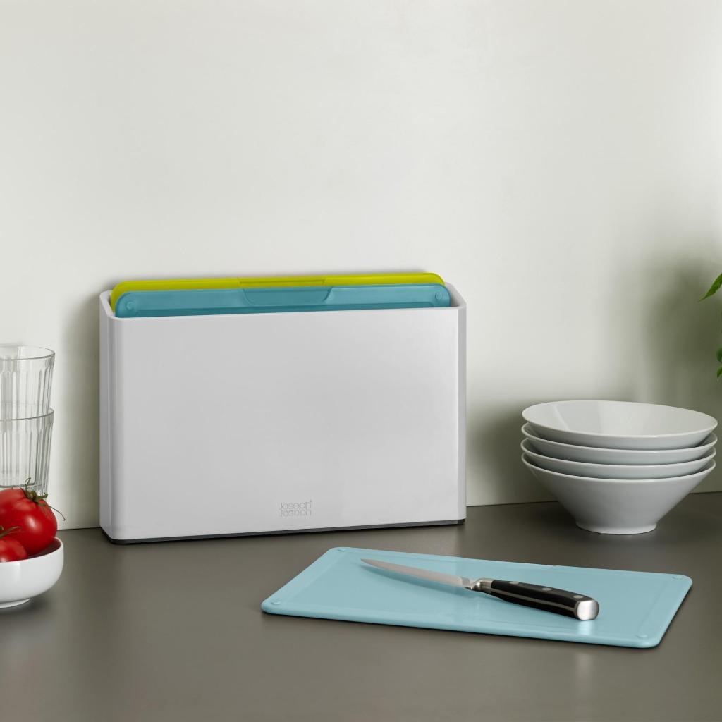 - El juego de tablas de cortar con soporte Joseph Joseph DUO OPAL representa una solución práctica para la preparación higiénicamente separada de ingredientes en la cocina doméstica diaria.