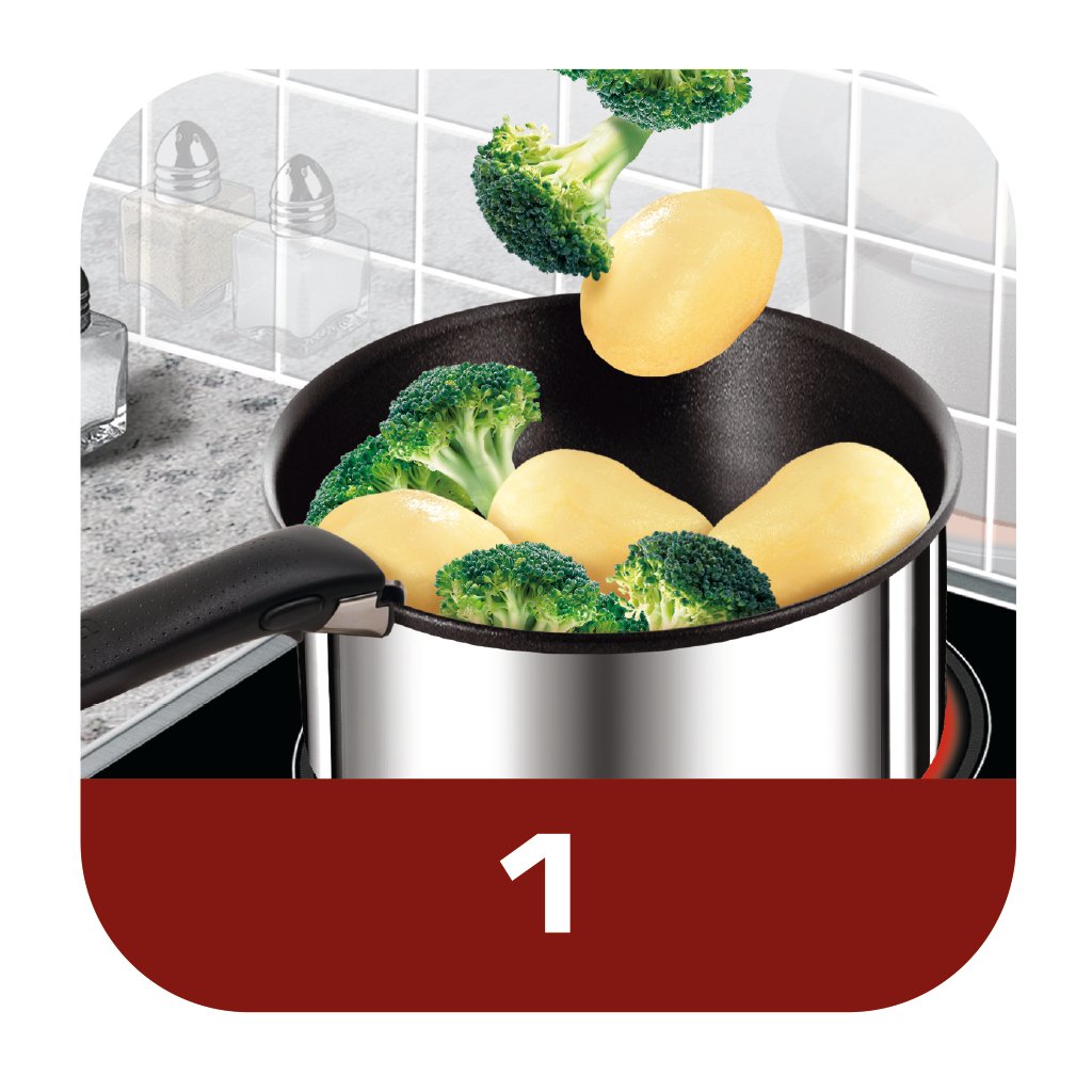 Tiene un borde de silicona de seguridad y un mango plegable para guardarlo fácilmente con otros utensilios. La ventaja de la serie de utensilios de cocina Tefal Ingenio es la posibilidad de apilar los recipientes y la práctica asa extraíble y segura con una capacidad de carga de 10 kg, que simplemente se engancha al recipiente y luego se quita para utilizarlo con el siguiente. Gracias a su superficie antiadherente 100% segura y duradera, la batería de cocina es resistente a los arañazos y fácil de limpiar. Es apto para el lavavajillas y puede utilizarse en todo tipo de placas de cocción, incluida la de inducción.