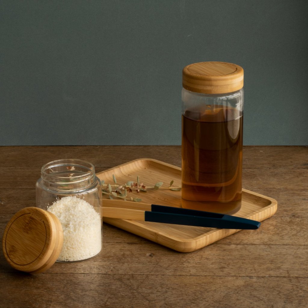 - tapa de bambú con junta de silicona para protegerla de la humedad y los olores