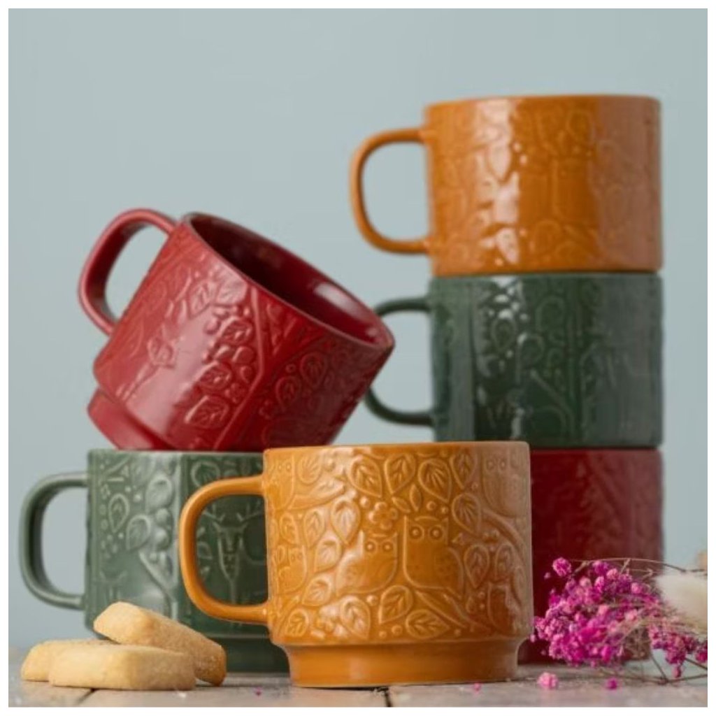 - una taza de café o té con un motivo en relieve con dibujos de animales en el bosque, que hace referencia a cuentos populares del siglo XIX