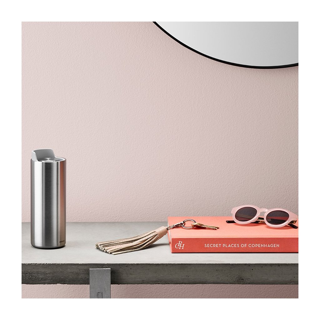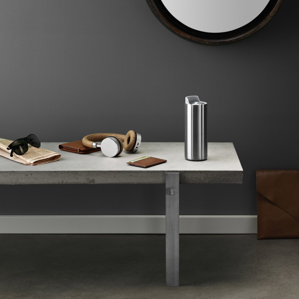 La taza térmica de acero inoxidable Urban To Go de la empresa danesa Eva Solo está hecha de acero inoxidable mate con doble pared. Gracias al vacío creado, aísla perfectamente y mantiene el té o el café caliente hasta 6 horas. Por supuesto, también funciona igual de bien para las bebidas frías El termo de 350 ml es 100% impermeable. El mecanismo de apertura con un clic hace que sea fácil abrir y cerrar el recipiente con una sola mano, incluso cuando se está en movimiento en un recado de trabajo o en el coche. Disponible en varias variantes de color.
