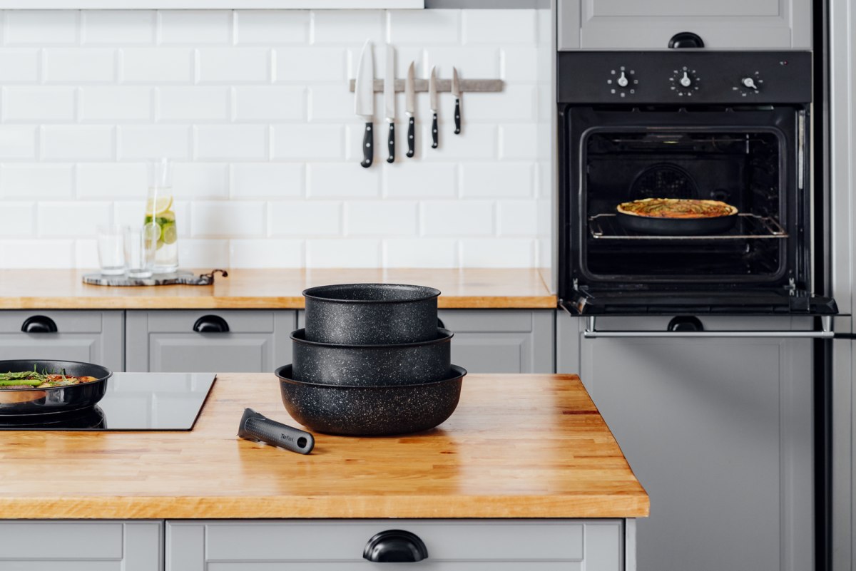 El apilamiento ahorra espacio. Gracias a la superficie antiadherente interior y exterior, se ahorra tiempo en la limpieza. Revestimiento antiadherente libre de PFOA, plomo o cadmio.