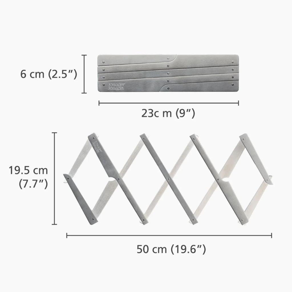 - La construcción extensible permite adaptar el tamaño de la base a ollas más pequeñas, así como a fuentes de horno, cazuelas y bandejas más grandes.