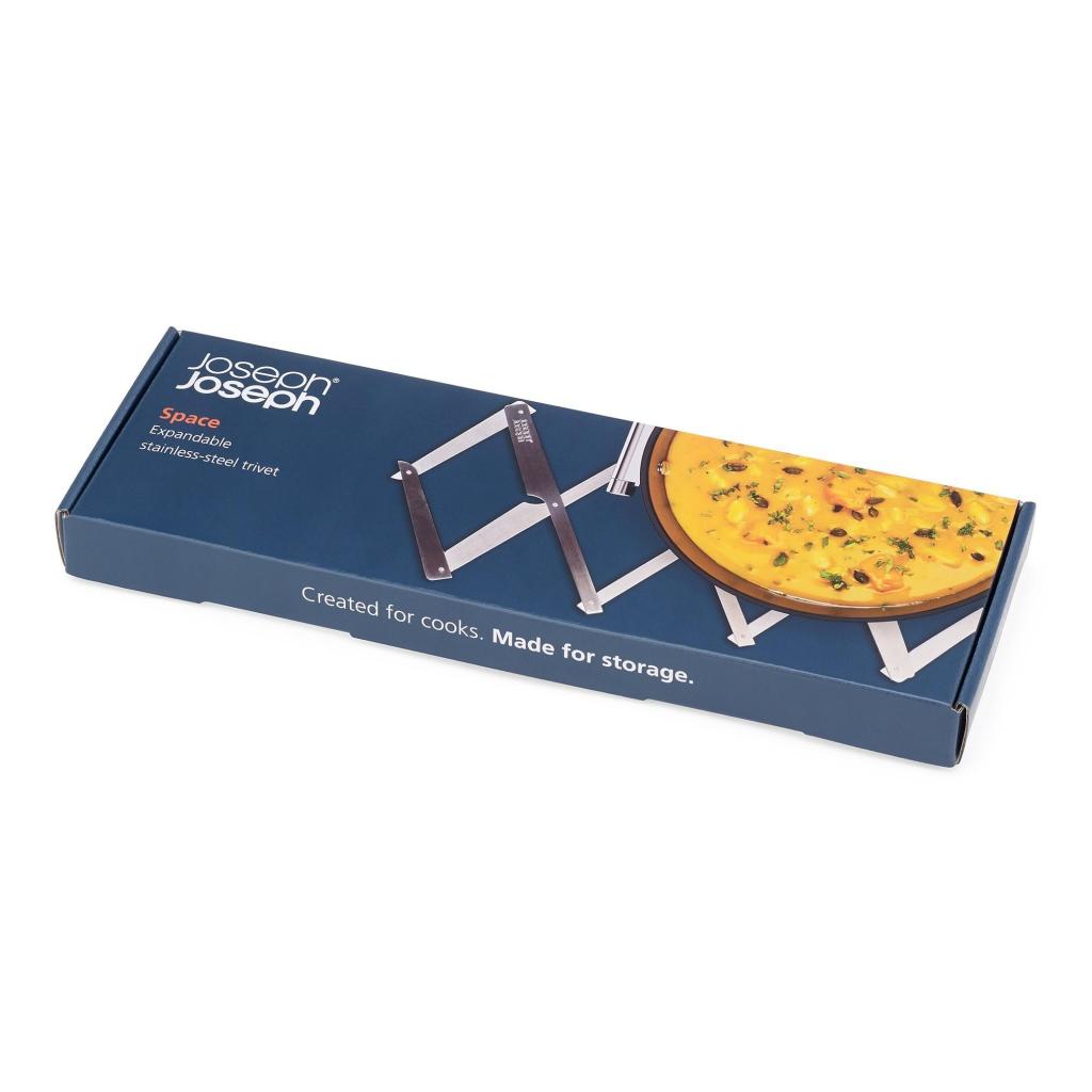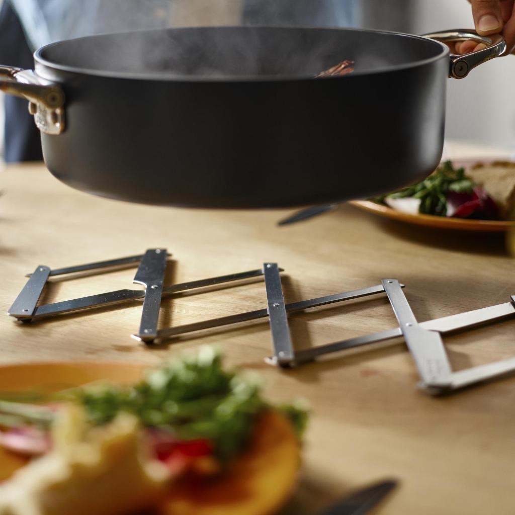 - Trébede Joseph Joseph SPACE protege encimeras y mesas de comedor de las altas temperaturas gracias a un mecanismo metálico expansible.