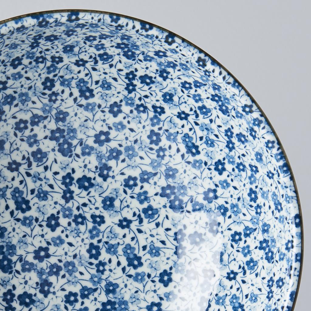 La colección Blue Daisy se caracteriza por sus pequeñas flores de color azul claro y oscuro sobre un fondo blanco. El estampado floral se inspira en los motivos tradicionales japoneses, que combinados con los tonos azules y blancos producen una impresión de calma. El plato tiene una forma irregular que remite a un trabajo artesanal y está bordeado de pintura oscura que se raya en algunos lugares.