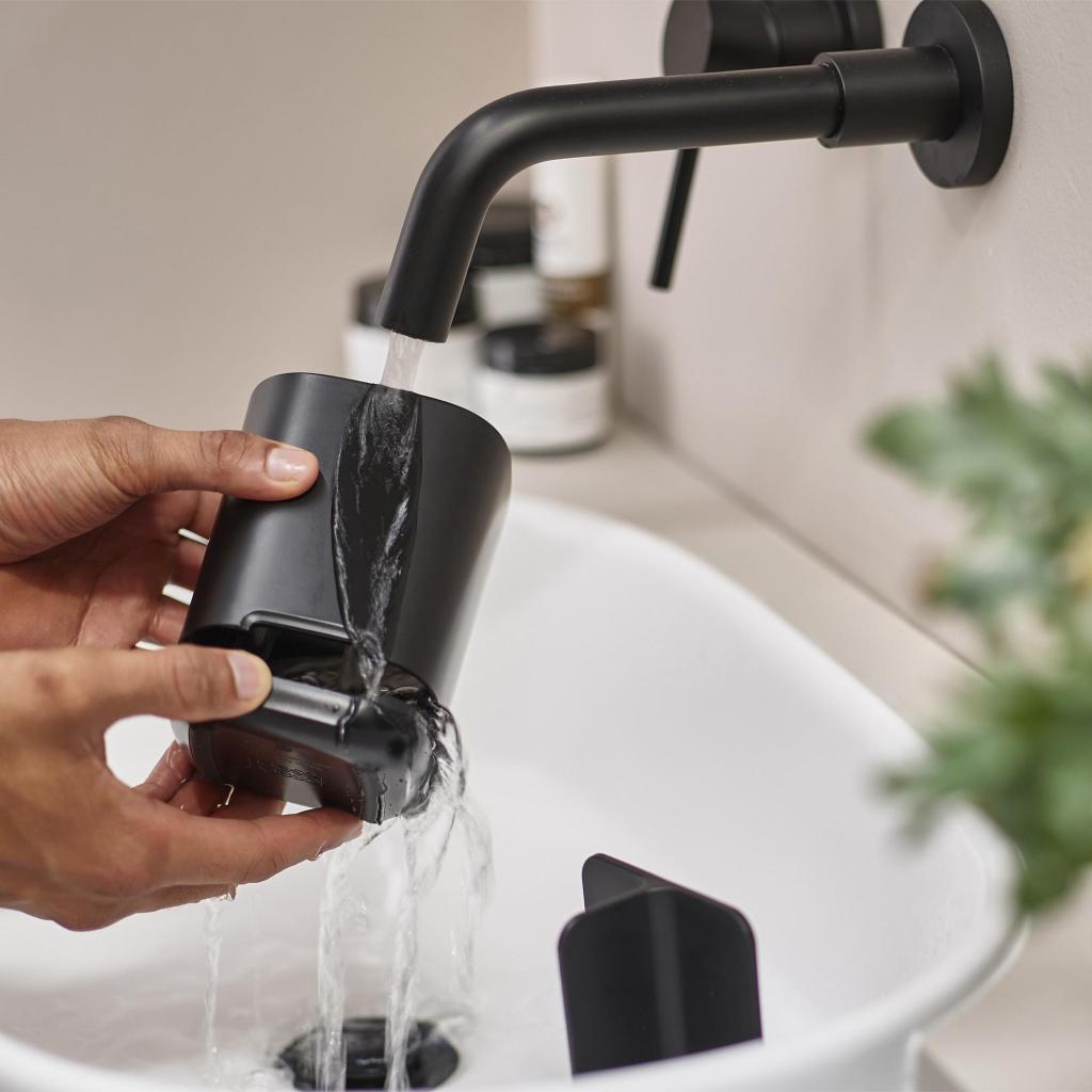 - El Vaso portacepillos EASYSTORE en acabado negro ofrece una solución elegante y práctica para la organización diaria de la higiene bucal en su baño.