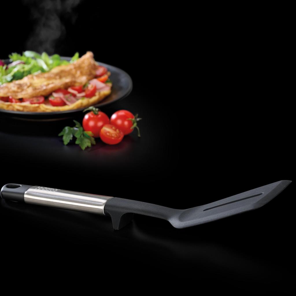 - El soporte integrado en el mango asegura que la parte activa del volteador no toque la superficie de trabajo durante la cocción.